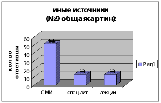 диаграмму1). Странно, почему о СПИДе разговоров было больше чем о сексе, ведь говорить о СПИДе, значит говорить и о сексе. Возможно, это значит и то, что родители не много знают по этой проблеме. По данным исследования, проведённого Лузиным П .М. и Шапиро А.Б., с родителями на эти темы разговаривает 20% людей в возрасте от 14 до 24 лет, и, хотя в нашем случае мы видим результаты чуть выше, мы полагаем, что родители должны уделять беседам по данным проблемам с подростками от 12 до 16 лет больше времени, т.е. находим эти показатели неудовлетворительными. Сравнивая наши результаты с показателями того же исследования, мы видим, что СМИ, как источник информации по данной проблеме, почти в три раза менее активен(в нашем случае), чем в группе лиц то 14 до 24 лет(34,5%), лекции в 7 раз(9%) и специальная литература примерно в 9(9%)(см. диаграмма2). Причинами столь низких показателей можно считать недоступность или отсутствие специальная литературы, недостаток подготовленных кадров для проведения лекций, а так же отсутствие интереса к данной проблеме вызванное малой информированностью и подростков, и родителей. Ещё можно отметить что 32% тестируемых имеют несколько источников информации( специальная литература СМИ и лекции в различных сочетаниях).