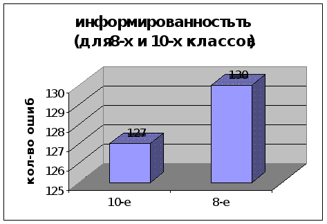 равняв количество тестируемых 8-х и 10-х классов, и подсчитав кол-во ошибок, допущенных ими, мы увидели, что показатели информированности почти