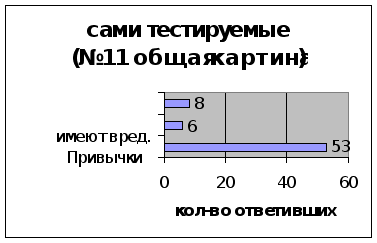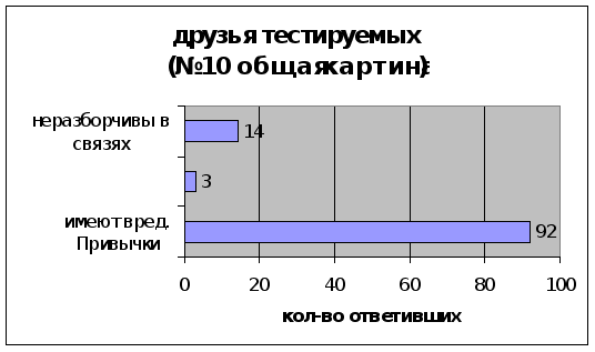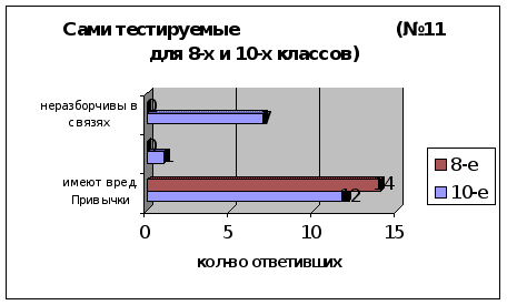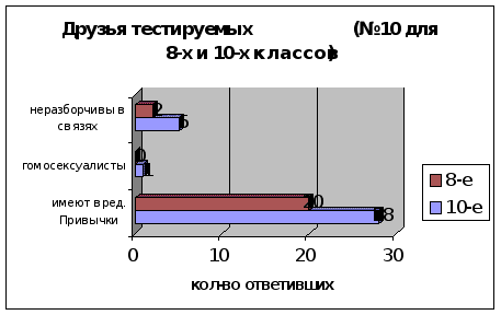 Диаграммы 8 и 9 нам показывают, что 10-классники имеют гораздо больше друзей, имеющих вредные привычки, по сравнению с 8-классниками, в то время как лиц с вредными привычками наоборот, больше в восьмых классах. Отсюда можно сделать вывод, что ученики 8-х классов более подвержены вредному влиянию, в то время как 10-классники уже поменяли свой круг интересов, что подтверждают две пары верхних столбиков в диаграммах 8 и 9.
