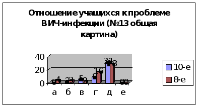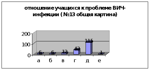 тношение к данной проблеме мы изучили с помощью специфического вопроса-ситуации(13). Глядя на диаграмму(см. диаграмму10) видно, что большинство подростков сами готовы бороться со СПИДом как с проблемой социальной, но, скорее всего, не знают как, о чём свидетельствует сравнительно низкий показатель информированности, а также то, что треть ответила ВлНа тебя это не повлияетВ». Мы это вывели из того, что достаточно малое количество тестируемых готово пренебречь дружбой, и достаточно много людей готово помочь другу, узнав, что он заражён ВИЧ. также можно заметить, что они далеки от сознания того, что такого человека можно уважать.