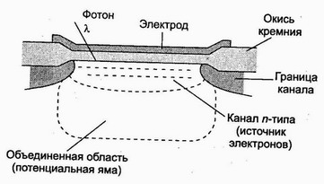 В кремниевой подложке р-типа создаются каналы из полупроВнводника n-типа. Сверку наносится изолирующий слой окиси кремния. Над каналами размещаются электроды из поликрисВнталлического кремния. При подаче электрического потенциала на электрод в обедненной зоне под каналом n-типа образуется так называемая потенциальная яма, которая способна хранить электроны. После попадания фотона на поверхность n-канала
