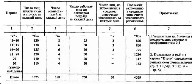 Отметим далее, что по приведенным выше данным можно определить среднюю списочную численность, а также по выдеВнленным в таблице группам персонала (не следует только забыВнвать, что данные по совместителям следует применять с коэффиВнциентом 0,5). Тогда после деления соответствующих показателей итоговой строки табл.2 на 30 (число календарных дней в апреВнле) получим среднее списочное число лиц, состоящих в списках, 119 человек, совместителей тАФ 3 человека, работавших по договоВнрам подряда тАФ 25, лиц, подлежащих исключению из среднего списочного числа, хотя и состоящих в списках, тАФ 2 человека, что в сумме и дает 145 человек.