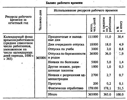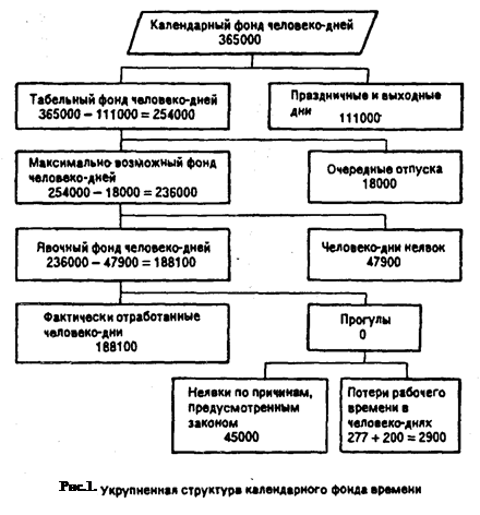 Далеко не весь объем календарного фонда времени работниВнков может быть реально использован в производственной деВнятельности фирмы. В составе календарного фонда времени кажВндого работника за достаточно длительный период обязательно будут выходные и праздничные дни; дни очередного и дополнительВнных отпусков, предусмотренные трудовым законодательством; дни неявок на работу по болезни и другим причинам, предусмотренных законом (участие в работе выборных общественных и других оргаВннизаций, выполнение мужчинами обязанностей, вытекающих из заВнкона о воинской службе); неявки на работу с разрешения админисВнтрации и, наконец, прогулы.