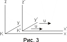тАЬНаша задача в точной формулировке сводится к следующему. Каковы значения x', y', z', t' некоторого события относительно движущейся со скоростью u системы координат K', если заданы значения x, y, z, t того же события относительно неподвижной системы координат K? Соотношения должны быть выбраны так, чтобы для одного и того же светового луча (причём для любого) относительно K и K' выполнялся закон постоянства скорости распространения света в пустоте. Эта задача для приведённого на рис. 3 пространственного расположения систем координат решается следующими уравнениями: