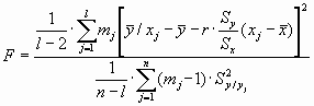 Если F превосходит критическое табличное значение при числах степеней свобода K1=l-2; K2=n-l надежностью P гипотезу о линейном характере усредненной зависимости y от x следует поставить под сомнение [70, 76, 80].
