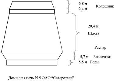 Внутреннее очертание вертикального разреза доменной печи называют её профилем, в котором различают колошник, шахту, распар, заплечики и горн. При конструировании диаметр и высоту этих элементов выбирают главным образом на основании анализа данных работы фактических печей. Для примера приведены размера для доменной печи N 5 ОАО "Северсталь" объёмом 5500 м3. Доменная печь снаружи заключена в металлический кожух толщиной 20-25 мм в верхней части и 35-40 мм в нижней, состоящий из ряда цилиндрических и конических поясов. Кожух выполняют цельносварным. С внутренней стороны кожуха находится огнеупорная футеровка, охлаждаемая холодильниками. Во многих случаях верхняя часть печи от распара до колошника опирается на так называемое мараторное кольцо, которое лежит на колоннах, а нижняя часть опирается на фундамент. Материал на колошник подают при помощи двух скипов, движущихся сверху вниз по наклонному мосту, либо же при помощи транспортёра.