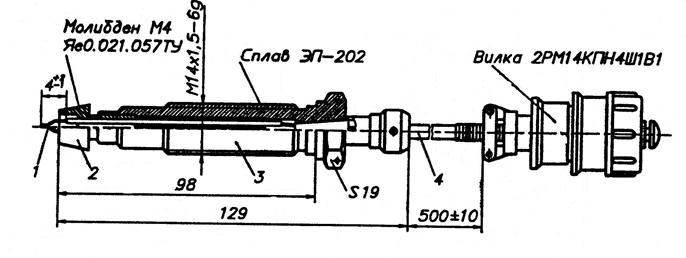 Чувствительным элементом датчика является открытая вольфрам-рениевая термопара с диаметром электродов 0,35 мм. Герметизация датчика и крепление чувствительного элемента в корпусе обеспечивается герметичным выводом из прессматериала ВЭП-1. Кабель датчика состоит из вольфрам-рениевых проводников, изолированных друг от друга и экранированных плетёнкой из нержавеющей стали.