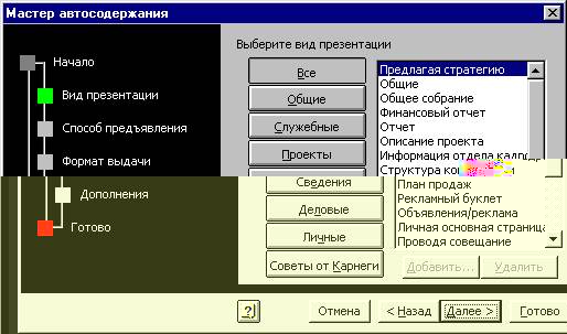 Наверное, среди предлагаемых в окне шаблонов вы сможете подобрать нужный. Если же все-таки подходящей темы не нашлось, нажмите кнопку Добавить или Все, чтобы получить список всех шаблонов презентаций. После выбора шаблона презентации (например, Финансовый отчет компании) и нажатия кнопки Далее вы попадете в окно мастера автосодержания, в котором необходимо выбрать способ демонстрации презентации. Если вы планируете проводить презентацию самостоятельно, оставьте включенной опц
