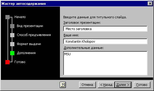 В последнем окне мастера автосодержания PowerPoint сообщает, что предварительная работа по созданию презентации завершена, и предлагает нажать кнопку Готово. Через некоторое время на экране появится титульный слайд презентации.