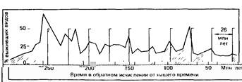 Откладывая на геологической шкале времени эпизоды массового вымирания (по горизонтальной шкале тАФ время в миллионах лет в обратном исчислении от нашей эпохи, по вертикальной тАФ процент выживших видов), палеонтологи обнаружили между ними регулярные интервалы в 26 миллионов лет (рис. 5). Очевидно, что такие вымирания земных живых организмов тАФ процессы сложные и зависящие от множества причин: резких изменений климата, оледенений, флуктуации уровня океанов, уменьшений концентрации кислорода в водах морей и океанов, что вызывает кислородное голодание, и наконец, различных внеземных обстоятельств.