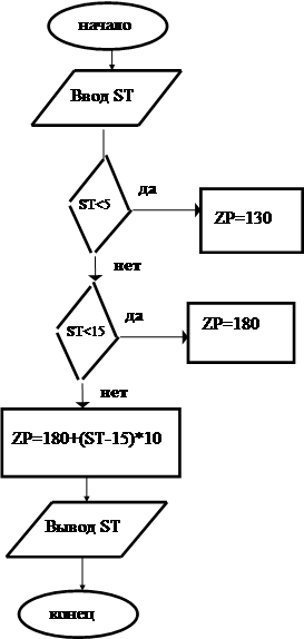 если стаж сотрудника менее 5 лет, то зарплата 130 руб., при стаже работы от 5 до 15 лет - 180 руб., при стаже свыше 15 лет зарплата повышается с каждым годом на 10 руб.