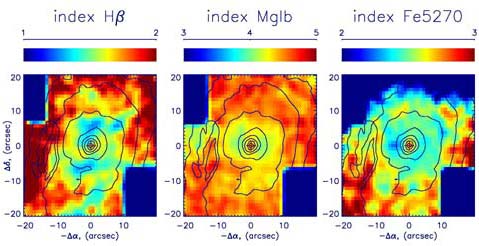 Если в центрах галактик ранних типов с большими балджами (S0 или Sa-Sb) есть компактные звездные структуры, возникшие во вторичной вспышке звездообразования, они должны быть видны не только по форме изофот или изовел. Активное звездообразование тАУ это быстрая химическая эволюция, потому что химические элементы тяжелее азота рождают в основном массивные звезды, которые живут недолго и успевают отдать в межзвездную среду вновь произведенные тяжелые элементы еще до окончания вспышки звездообразования. Поэтому компактные околоядерные диски тАУ продукты вторичных вспышек звездообразования тАУ должны выделяться на фоне окружающих их старых звездных сфероидов более молодым возрастом звезд и повышенным содержанием в них металлов. Двумерная спектроскопия обеспечивает нас полной информацией от протяженного участка галактики, и следовательно, мы можем построить двумерные карты эквивалентной ширины (на самом деле, глубины) линий поглощения в спектре. Линии поглощения в интегральном спектре галактики порождаются более всего звездами, причем известно, какие линии какими именно звездами. Так, за линии поглощения водорода ответственны в основном звезды класса A тАУ довольно массивные, порядка 2МВд, и возраст их не может быть больше 1тАУ2 млрд. лет. Поэтому, грубо говоря, чем глубже линии водорода в интегральном спектре, тем больше относительно молодых звезд в галактике или в галактической структуре, спектр которой мы наблюдаем. Линии поглощения металлов (например, сильный триплет магния на длине волны 5175 ? или многочисленные линии железа) тем глубже, чем больше металличность звезд. Правда, есть один нюанс: в молодых массивных звездах линии металлов всегда слабые (эквивалентная ширина их мала), даже если металличность этих звезд велика. Здесь выручает совместный анализ линий металлов и линий водорода: если их сопоставить, то эффекты возраста и металличности можно разделить и определить одновременно оба параметра.