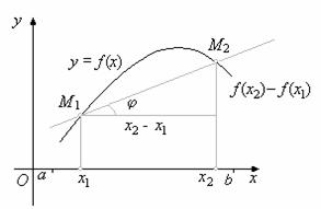 где x1, x2, - произвольные точки отрезка [a, b] x, - некоторая точка отрезка [x1, x2]. Возьмём модуль обеих частей равенства (4.3) и заменим в правой части | f тАШ(x)| на m. В результате по- лучим неравенство (4.3) с a=m. Рис.2.3 даёт геометрическую иллюстрацию установленного свойства. Согласно формуле Лагранжа (5.3) каждой секущей графика функции y = f(x) мож- но поставить в соответствие параллельную её касательную. Поэтому наибольший тангенс угла наклона касательных, и его можно оценить той же константой m: |k| £ m.