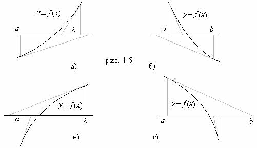 Будем предполагать, что функция f(x) непрерывна на отрезке [a, b] (для метода хорд можно потребовать на интервале) и имеет на этом интервале первую и вторую производные, причём обе они знакопостоянны (в частности отличны от нуля). Будем также предполагать, что функция f(x) принимает на концах отрезка значения разного знака. В силу знакопостоянства первой производной функция f(x) строго монотонна, поэтому при сделанных предположениях уравнение (1.1) имеет в точности один корень на интервале (a, b).