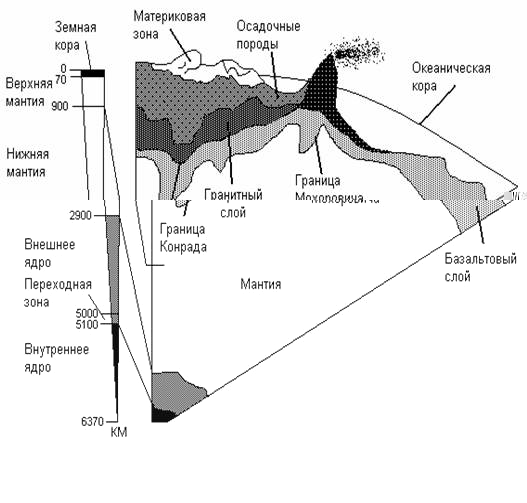 Основную роль в исследовании внутреннего строения Земли играют сейсмические методы, основанные на исследовании распространения в ее толще упругих волн (как продольных, так и поперечных), возникающих при сейсмических событиях тАФпри естественных землетрясениях и в результате взрывов. На основании этих исследований Землю условно разделяют на три области: кору, мантию и ядро (в центре). Внешний слой тАФкора тАФимеет среднюю толщину порядка 35 км. Основные типы земной коры тАФконтинентальный (материковый) и океанический; в переходной зоне от материка к океану развита кора промежуточного типа. Толщина коры меняется в довольно широких пределах: океаническая кора (с учетом слоя воды) имеет толщину порядка 10 км, тогда как толщина материковой коры в десятки раз больше.