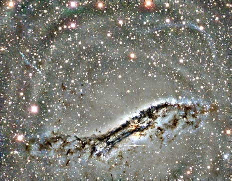 Едва заметная голубая арка, образованная потоком молодых звезд (200-400 млн. лет) в галактике Центавр А. По-видимому, этот звездный поток появился в результате недавнего поглощения гигантской эллиптической системой небольшой спиральной галактики, которая уже разорвана приливными силами и растянулась в трубку.