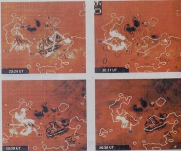 Рис 2. Эволюция активной области на Солнце. Событие 26 марта 1991г. Видны солнечные пятна и нейтральные линии магнитного поля (светлые линии). Время - по Гринвичу