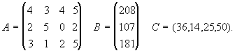 Исходные параметры задачи могут быть представлены в виде технологической матрицы A затрат ресурсов на единицу продукции каждого вида, вектора B объемов ресурсов и вектора C удельной прибыли:
