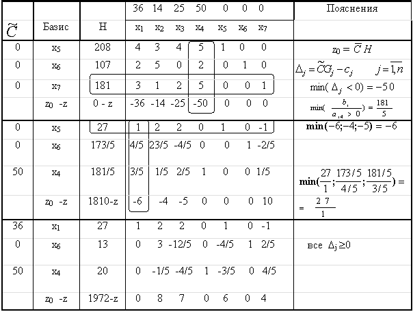 В последней симплексной таблице указать обращенный базис Q-1, соответствующий оптимальному набору базисных неизвестных. Проверить выполнение соотношения