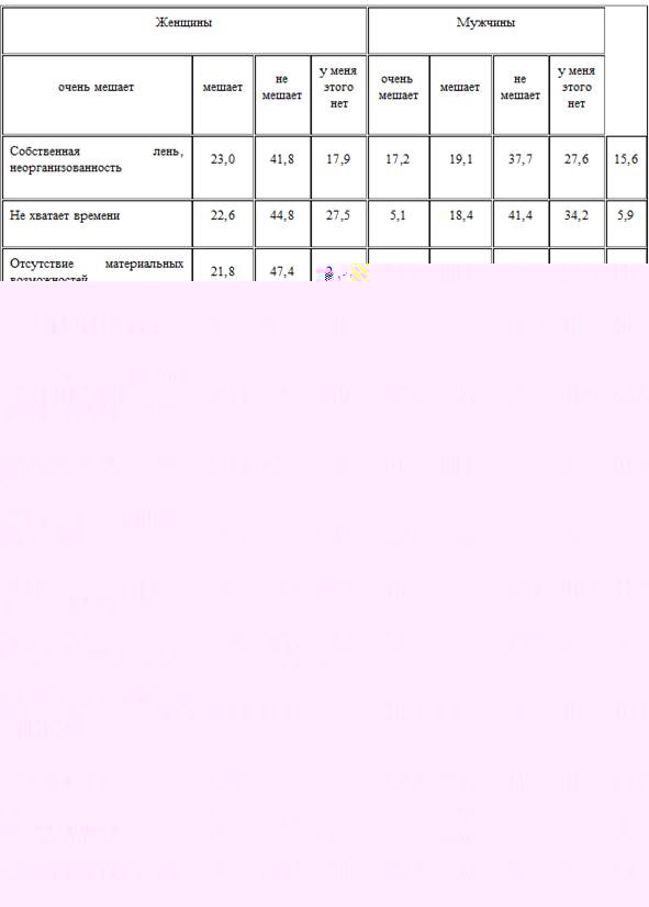 Анализируя препятствия к ведению здорового образа жизни, важно понимать, что в действительности стоит за ответами респондентов. Одним из возможных факторов, влияющих на них, может быть конкуренция потребностей, тАУ то, что человеку мешает вести более здоровый образ жизни, для него важнее, чем здоровье.