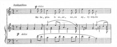 Починаiться романс не з тонiки, а з VI ступеня. Специфiчну барву вносять септакордовi структури, плагальнi звороти. Завершуiться перша фраза на тонiцi, яка з'являiться на слабiй долi. У фортепiаннiй партii звучить канонiчна iмiтацiя. Отже, складнiсть образу, його психологiчна насиченiсть створюiться комплексом засобiв. У такому ж ключi витримуiться весь романс тАУ мелодiя розгортаiться невеликими за амплiтудою побудовами, в гармонii зустрiчаiмо ряд септакордiв, плагальних зворотiв, незмiнним залишаiться i фактурний, акомпануючий пульс (синкопами) та канонiчна iмiтацiя в приму.