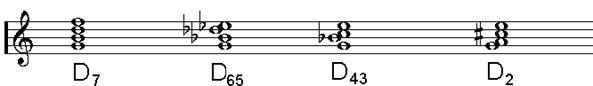 Обращение можно получить, перенеся нижний звук аккорда на октаву вверх. Собственно, необязательно на одну октаву. Главное, чтобы нижним звуком стал другой тон аккорда. Названия обращений септаккорда образуются от двух интервалов: между нижним звуком и примой аккорда, и между нижним звуком и септимой аккорда.