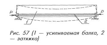 Продольные затяжки в виде арматурных стержней или прокатных профилей располагают вдоль растянутой грани ферм (балок) и закрепляют на торцах. Под воздействием внешней нагрузки балка прогибается, а ее опорные сечения (торцы) поворачиваются (рис. 3). При повороте торцы увлекают за собой затяжку, удлиняют ее и вызывают в ней растягивающее усилие, которое, в свою очередь, действует на балку в виде сжимающей силы Р. От этой силы в балке возникает разгружающий момент Мp=-Ре, где е тАФ расстояние от силы Р до центра тяжести сечения. В отличие от усиления шпренгелем, поперечные силы здесь не уменьшаются и разгружение опорных участков (наклонных сечений) не происходит.