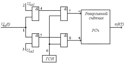 Рис.7. Схема дискриминатора при аналого-цифровом преобразовании вне контура регулирования: Uз тАУ импульс запуска, привязанный по времени к излучаемому сигналу; Uу тАУ импульс приемника.