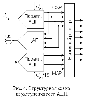 Верхний по схеме АЦП осуществляет грубое преобразование сигнала в четыре старших разряда выходного кода. Цифровые сигналы с выхода АЦП поступают на выходной регистр и одновременно на вход 4-разрядного быстродействующего ЦАП. Во многих ИМС многоступенчатых АЦП (AD9042, AD9070 и др.) этот ЦАП выполнен по схеме суммирования токов на дифференциальных переключателях, но некоторые (AD775, AD9040A и др.) содержат ЦАП с суммированием напряжений. Остаток от вычитания выходного напряжения ЦАП из входного напряжения схемы поступает на вход АЦП2, опорное напряжение которого в 16 раз меньше, чем у АЦП1. Как следствие, квант АЦП2 в 16 раз меньше кванта АЦП1. Этот остаток, преобразованный АЦП2 в цифровую форму представляет собой четыре младших разряда выходного кода. Различие между АЦП1 и АЦП2 заключается прежде всего в требовании к точности: у АЦП1 точность должна быть такой же как у 8-разрядного преобразователя, в то время как АЦП2 может иметь точность 4-разрядного.