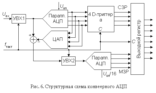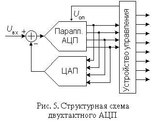 Рассмотрим пример 8-разрядного последовательно-параллельного АЦП, относящегося к типу многотактных (рис. 5). Здесь процесс преобразования разделен во времени.