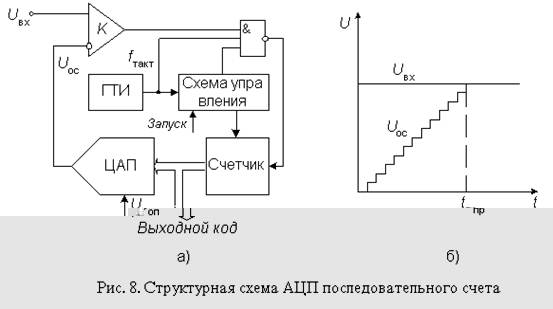 Этот преобразователь является типичным примером последовательных АЦП с единичными приближениями и состоит из компаратора, счетчика и ЦАП (рис. 8). На один вход компаратора поступает входной сигнал, а на другой - сигнал обратной связи с ЦАП.