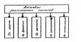 Ансамбли различаемых сигналов, т.е. группы M однородных сигВнналов, должны отличаться по какому-то параметру или признаку - форме, времени, частоте, пространству, поляризации (рис. 1):