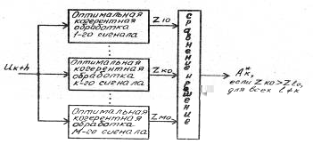 приходим к выводу о том, что структура устройства различения M сигналов должна быть многоканальной (М каналов), а оптимальная обВнработка сигналов в каждом канале должна сводиться к их когерентному накоплению (фильтровому или корреляционному) с одинаковым смещением
