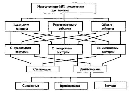 В магнитотерапевтических аппаратах, имеющих наборы индукторов, предусмотрены режимы, при которых осуществляется воздействие, распределенное в заданной области пространства. В некоторых системах, позволяющих осуществлять общее воздействие на весь организм челоВнвека, представляется возможным на фоне пространственно равномерной структуры поля формировать локально усиленные (ослабВнленные) поля, а также неоднородности заданной формы. ЗаВнметим, что поля, характеристики которых не изменяются в пространстве, называют статическими, а поля, изменяющиеся и перемещающиеся в пространстве, называют динамическими. Большинство выпускаемых магнитотерапевтических аппаратов формируют, как правило, статичесВнкие поля. Комплекс ВлАврора МК-01В» имеет программно-аппаратные средства для создания как статических, так и динамических полей. ВозВнможное множество разновидностей пространственно-организованных искусственных МП представлено на рис. 1.