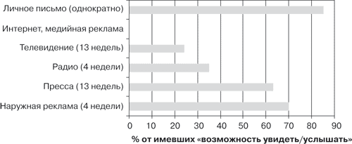 Рис. 1.2 Сравнительная эффективность рекламирования в прессе (13 недель, одно объявление в номере) и на ТВ (13 недель по 100 GRP)