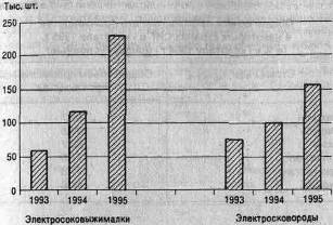 Рис. 4. Динамика производства некоторых видов товаров хозяйственного потребления за 1993-1995 гг.