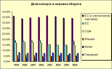 Во-первых, за исключением трех лет ВлпровалаВ» (с 2003 по 2005 годы) относительная доля Евросоюза в мировом импорте превышала соответствующую долю для США. И если ЕС удалось в 2006 году вновь значительно нарастить импорт, то доля США так и осталась на уровне примерно в 15%. При этом если учитывать еще и торговлю между странами внутри Евросоюза, то получается, что за рассматриваемый срок доля региона в совокупном импорте практически не менялась и оставалась около отметки в 40%.(все расчеты проводились в долларах в текущих ценах).