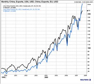 Несколько иначе выглядит ситуация с экспортом. За рассматриваемый период доля экспорта из Китая в азиатские страны сократилась с 60% до 46% (график 3) при том, что аналогичные показателя для остальных основных торговых партнеров не претерпели существенных изменений. При этом к концу 2006 года доля ЕС в качестве экспортного рынка Китая практически сравнялась с долей США: 18,6% и 20,8%, соответственно, а в июле и августе 2007 года абсолютная величина экспорта в ЕС превзошла аналогичный показатель для США (график 4).