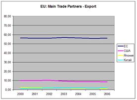 Для Евросоюза ситуация с экспортом выглядит в целом аналогично импорту: в начале 2003 года доля США в экспорте сократилась, составив менее 10%, и на этой отметке она продолжает оставаться и по сей день, в 2006 году достигнув 8,58% (график 6). При этом доля экспорта внутри ЕС, хоть и аналогичным образом продемонстрировала отрицательную динамику, все еще прочно держится в районе 55%. Даже несмотря на то, что доля Китая сильно возросла, все же она еще не столь значительна и не дотягивает даже до экспортных показателей Соединенных Штатов.
