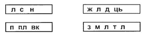 (Учитель показуi картки iз словами, в яких пропущенi деякi лiтери. Учнi шукають у текстi слова, якi б пiдiйшли i записують нижче.)