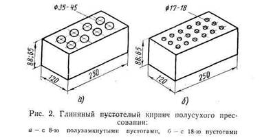 Глиняный обыкновенный сплошной (полнотелый) И пустотелый кирпичи являются основными видами продукции отечественной кирпичной промышленности. Различают кирпич пластического прессования и кирпич полусухого прессования, изготовленный из глин с добавками или без них и обожженный.