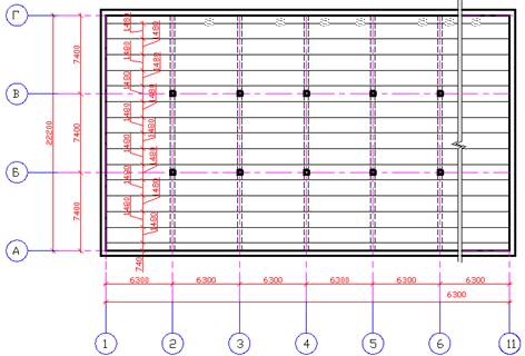 Размеры здания в осях: длина 63м., ширина22,2м. В продольном направлении проведено 4 оси т.е. получили 3 пролёта, в поперечном направлении проведено 11 осей т.е. получили 10 пролётов. Ригели укладываются в поперечном направлении. Размеры конструктивной ячейки 6.3