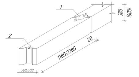 Фундаментные блоки: 1-шпонка заполняется бетоном класса В20, 2-ниша строповочной петли