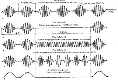 Генератор средней частоты создает синусоидальные колебания частотой 5 кГц. В модуляторе происходит амплитудная модуляция этих колебаний напряжением, создаваемым генератором низкой частоты. Модулированное напряжение поступает на усилитель и затем в выходную цепь. Электронный коммутатор осуществляет 4 различных рода работы, представляющих собой чередование разных видов тока. Измеритель тока позволяет контролировать среднеквадратическое значение тока в выходной цепи. Блок питания обеспечивает необходимыми напряжениями все блоки аппарата.