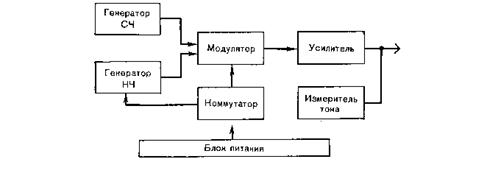 Модулятор включает в себя усилитель низкой частоты и собственно модулятор. Выходной усилитель собран по двухкаскадной схеме с трансформаторным выходом. Измерение среднеквадратического значения тока в выходной цепи производиться с помощью измерительного устройства, на выходе которого включен миллиамперметр.