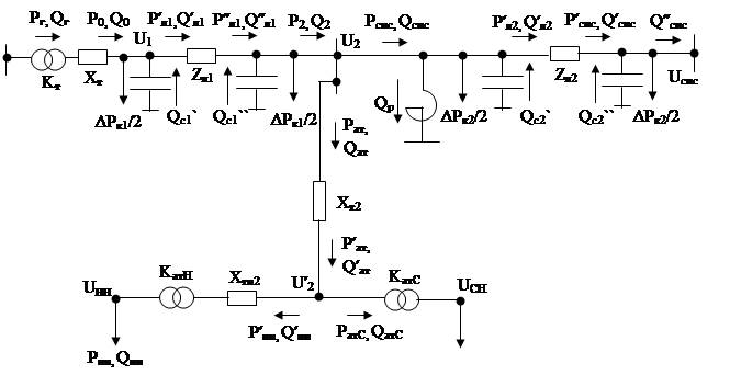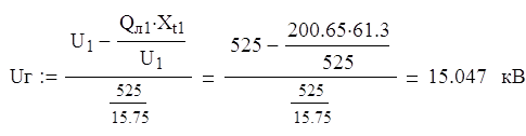 U2 = Uсис тАУ ( Р′′л2∙R2+ Q′′л2∙X2)/ Uсис = 510 тАУ (1151,85 ∙7,015тАУ 35,58 ∙66,82)/510