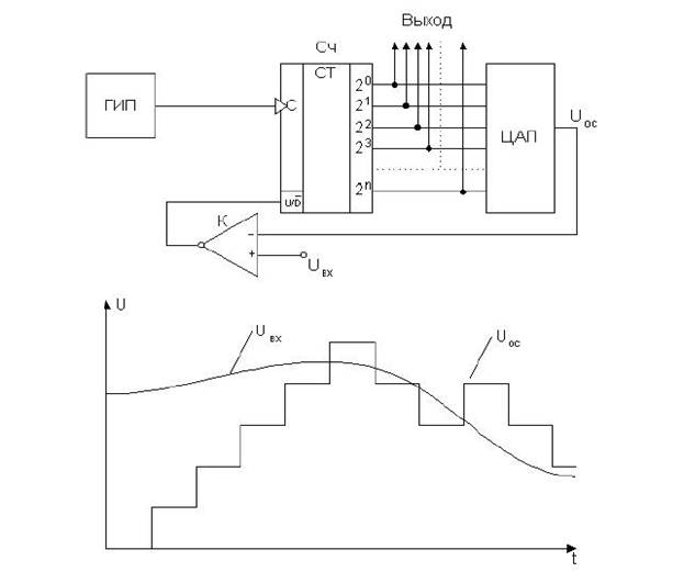 Эта схема отличается от схемы преобразователя предыдущего типа тем, что в ней используется реверсивный счетчик Сч, управляемый сигналами свыхода компаратора К. При Uвх > Uос счетчик устанавливается в режим прямого счета, поступающие на вход импульсы генератора ГИП последовательно увеличивают в нем число, растет напряжение Uос, до уровня напряжения Uвх. При Uвх < Uос счетчик переводится в режим обратного счета, при котором убывает число в счетчике и, следовательно, убывает напряжение Uос, пока не будет достигнуто значение Uвх.