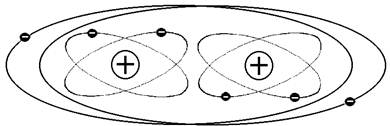 Найпростiшу модель молекули зображено на рис. 2. У цiй молекулi сполученi два однаковi атоми, причому навколо ядра кожного атома обертаються тАЬсвоiтАЭ електрони, а два електрони обертаються навколо обох ядер водночас. Вони i начебто спiльними для обох атомiв i обтАЩiднують iх в молекулу.