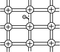 Чи може протiкати електричний струм в такiй речовинi? Виявляiться, все залежить вiд того, як стiйко тримаються електрони на орбiтi. Якщо орбiти електронiв у речовинi дуже стiйкi i електрони не полишають iх за жодних умов (при пiдвищеннi температури, прикладеннi до куска матерiалу рiзницi потенцiалiв), то ця речовина i типовим iзолятором. Характерною ж властивiстю напiвпровiдникiв i те, що електрони, в цих матерiалах, можуть залишати своi орбiти внаслiдок дii свiтла, тепла, електричного поля тощо. Схематично, уявимо собi кристал напiвпровiдника так, як це зображено на рис. 4. Припустимо, що один з електронiв покинув свою орбiту i полетiв у мiжатомний простiр матерiалу. Якби до напiвпровiдника прикласти рiзницю потенцiалiв, то електрон полетiв би у напрямку позитивного електрода (природа походження такого електричного струму притаманна звичайному провiднику).