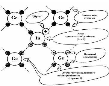 Домiшкою для утворення в напiвпровiднику тАУобластi може бути алюмiнiй, iндiй, бор та iн. Усi вони i акцепторами, оскiльки iх атоми забирають електрон у сусiднiх атомiв.